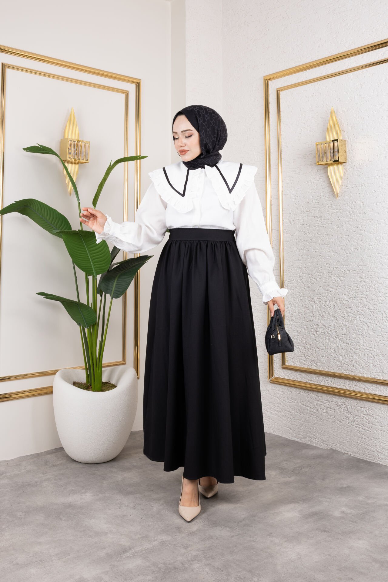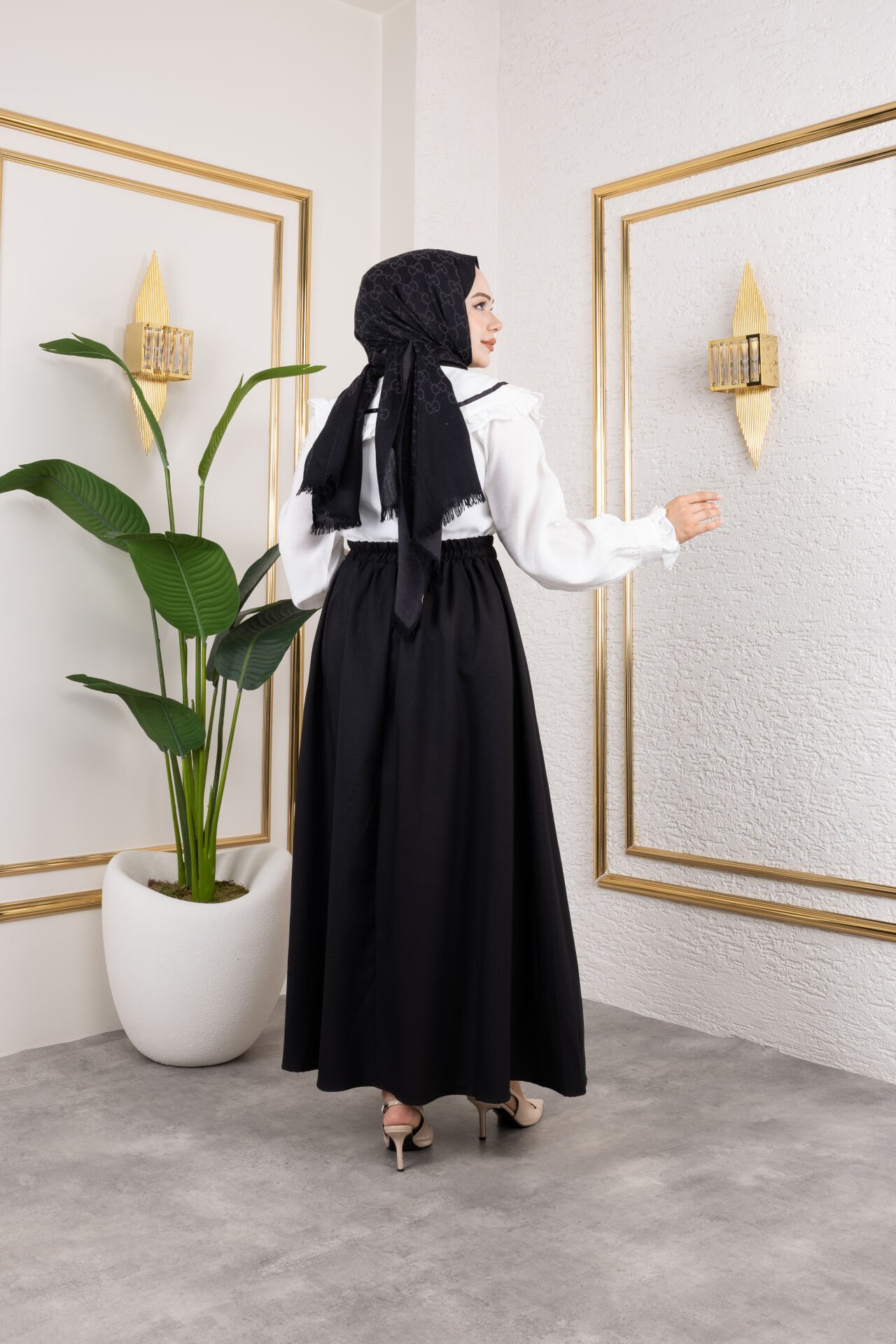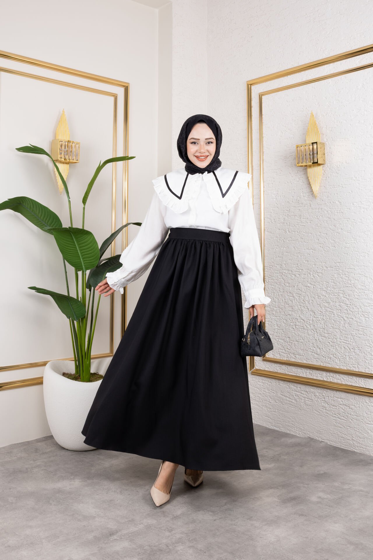 Bu çan kesim etek, standart (oversize) kalıpta olup 36-40 beden aralığına uygundur. Bel kısmı önden düz, arkadan lastiklidir, hem şık bir görünüm hem de rahat bir kullanım sunar. Kloş etek ucu ve doğal büzgü detayları dinamik bir görünüm yaratır. Yaz ayları için mükemmel olan hafif kumaşı, nefes alabilirlik ve konfor sağlar. Ürün astarsızdır; açık renkler için iç göstermemesi adına ten rengi iç çamaşırı önerilir. Tesettüre uygun uzun yapısıyla zarafet ve konforu birleştirir. Ürün uzunluğu: 98 cm. (1-3 cm değişiklik gösterebilir.) Ürün Ölçüleri: Bel: 70 cm / Esnetilmiş Bel: 104 cm / Etek Çanı Tam Genişliği: 260 cm. Kumaş Türü: Viskon Keten Kumaş. Model Bedeni: Model STANDART beden giymektedir.