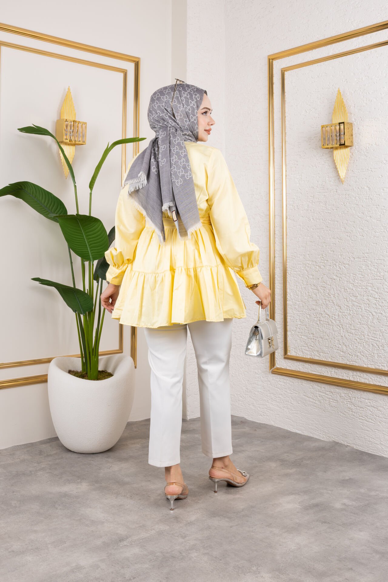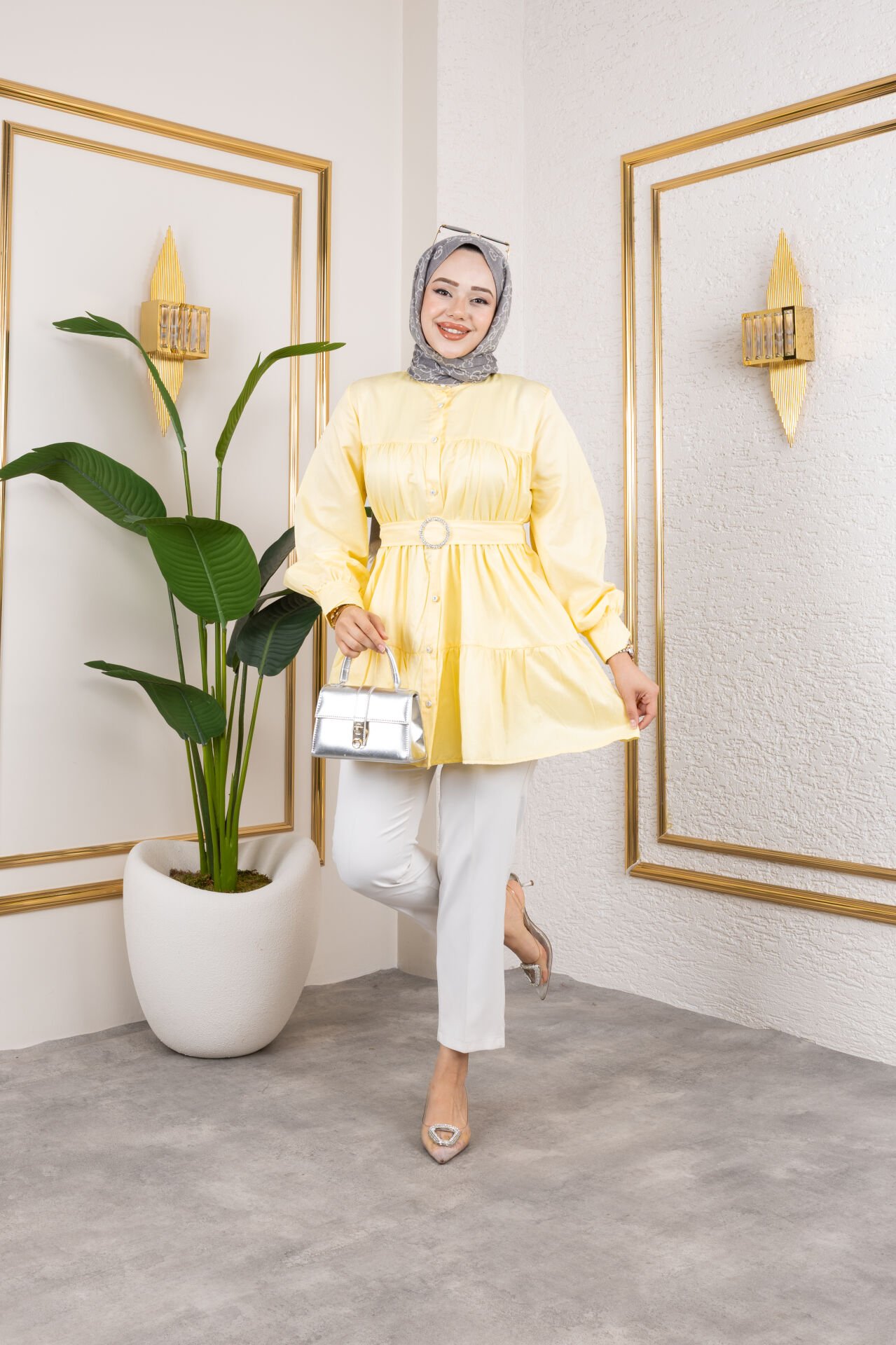 Bu tunik, beli belirginleştiren kemeri ve katmanlı detaylarıyla şık bir tasarıma sahiptir. Sarı rengi, mütevazı kombinler için mükemmel bir parça haline getiren bir zarafet ve sofistike dokunuşu katar. Tunik 80 cm uzunluğundadır ve 36 ila 40 beden aralığında mevcuttur. Detaylar: Uzunluk: 80 cm (1-3 cm değişiklik gösterebilir)