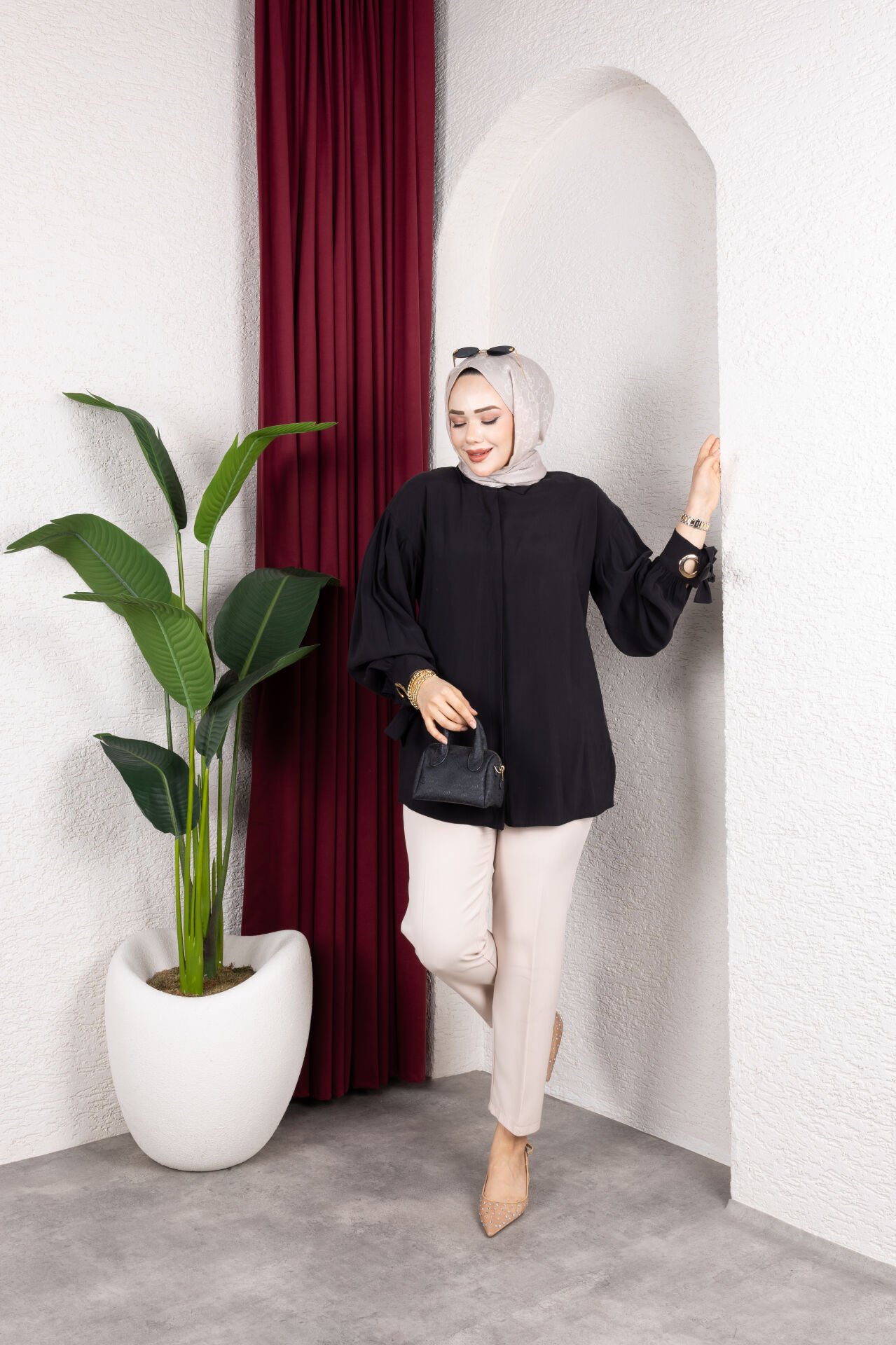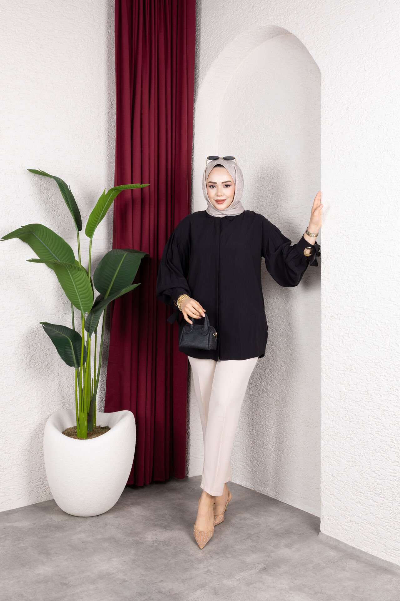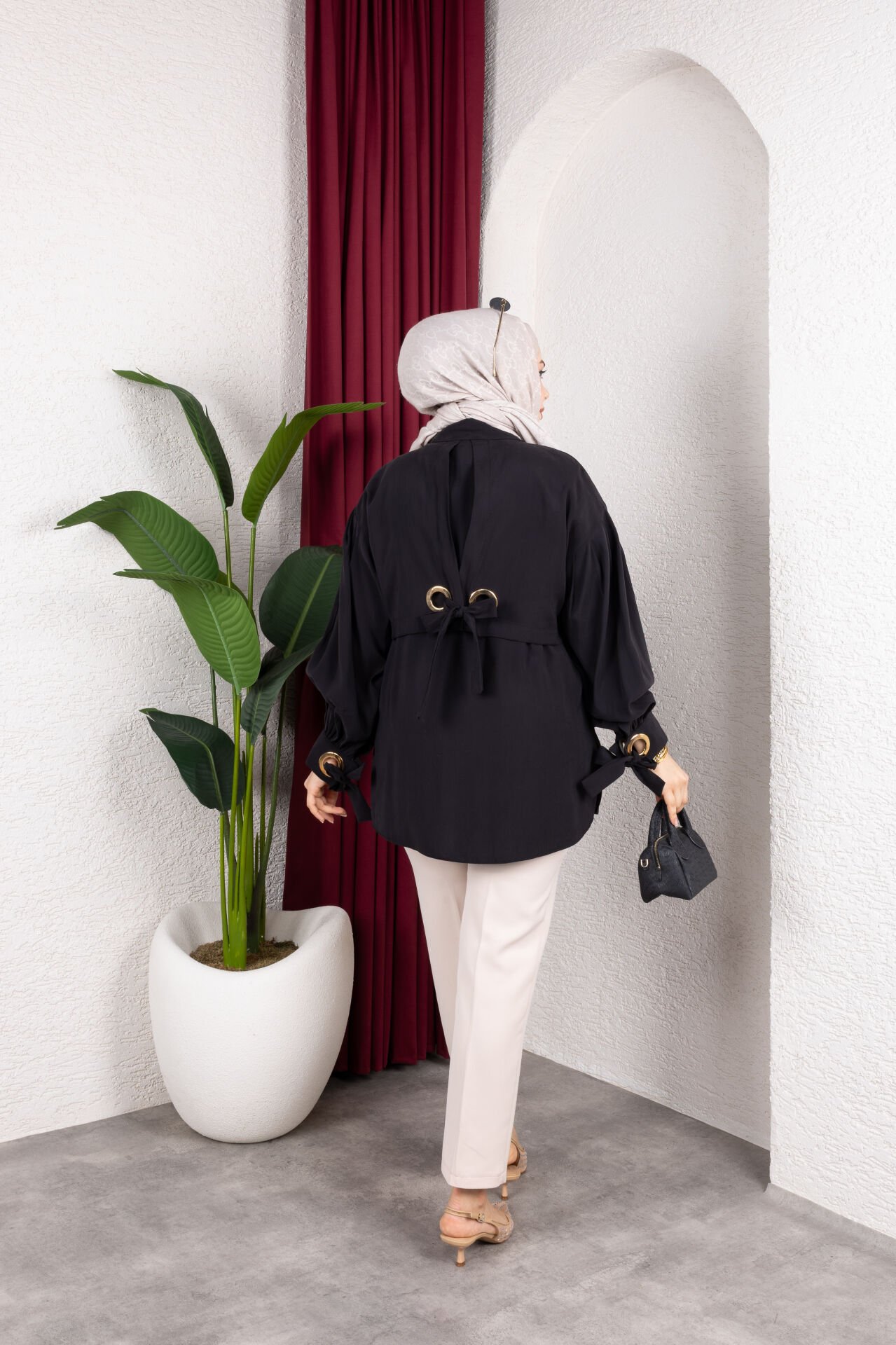 Kollar: Modern ve şık balon kol yapısı, kol manşetlerindeki altın rengi halka ve bağlama detaylarıyla hareketlendirilmiştir.