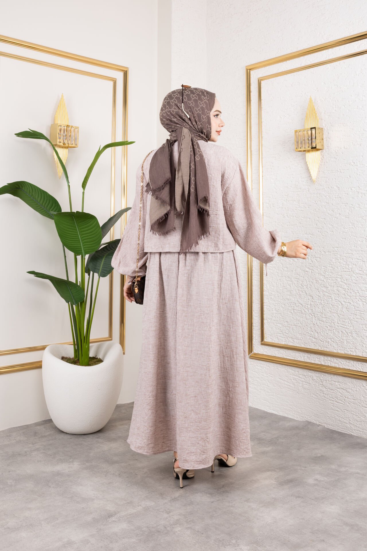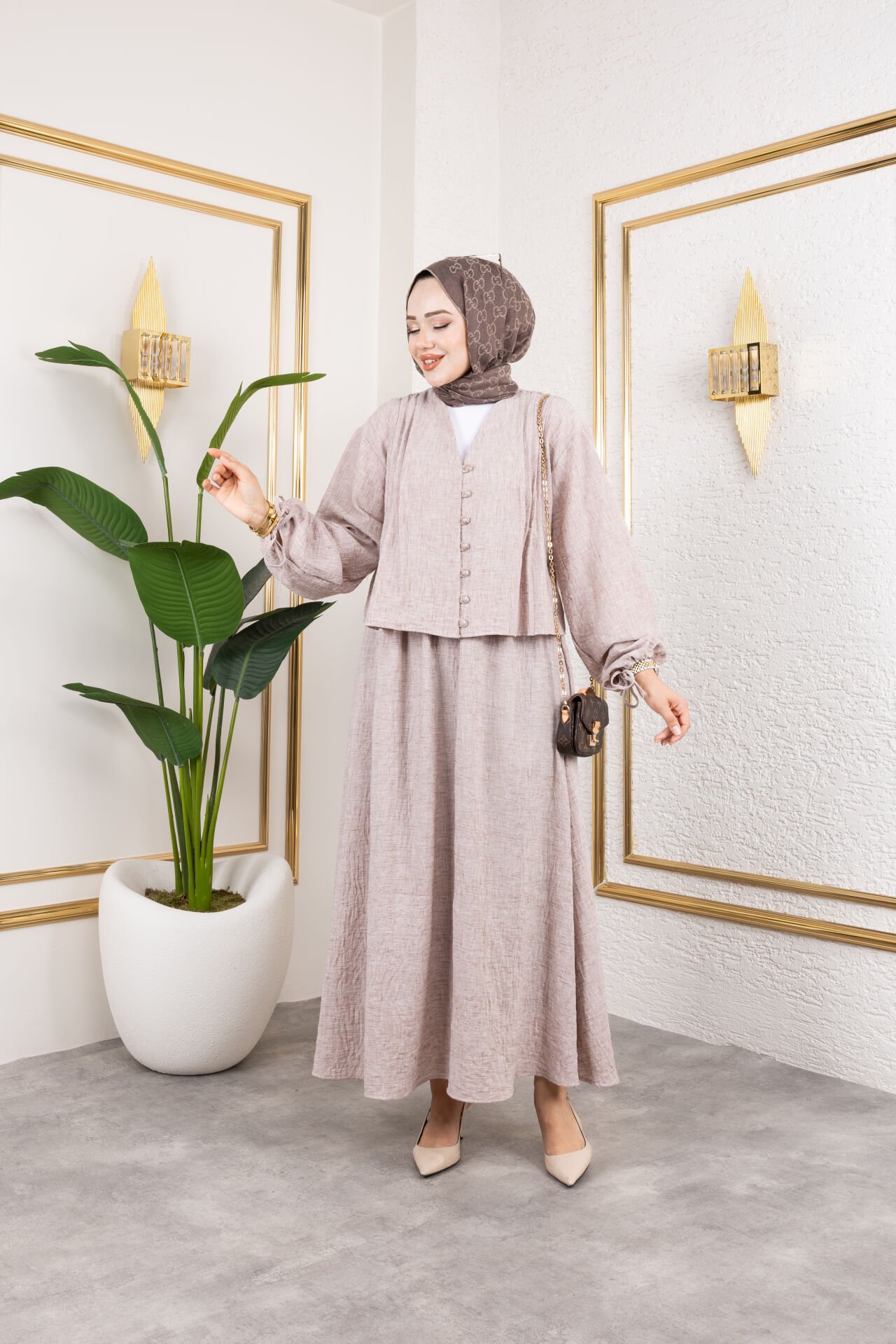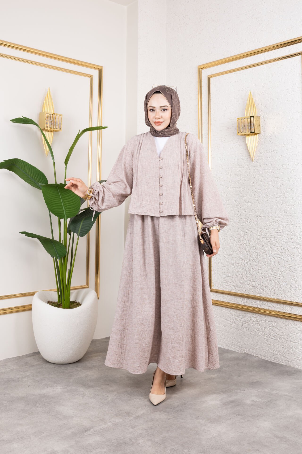 Nervür detaylı bu takım, standart (oversize) kalıpta olup yalnızca 36-40 beden aralığına uygundur. Üst kısım, düğmeli tasarımı, bağlama kolları ve ön kısmındaki zarif nervür detaylarıyla öne çıkar. Alt parça ise lastikli bel detaylı, kloş kesim bir etektir. Yazlık, yumuşak keten kumaştan üretilmiştir, hem hafif hem de konforludur. Günlük şıklık ve rahatlık arayanlar için ideal bir ikilidir. Tunik uzunluğu: 50 cm. Tunik Ölçüleri: Göğüs: 98 cm / Bel: 118 cm / Basen: 118 cm. Etek uzunluğu: 98 cm. Etek Ölçüleri: Bel: 66 cm / Bel Lastik Esnetilmiş Hali: 128 cm / Etek Çan Genişliği: 260 cm. Kumaş Türü: Keten Kumaş